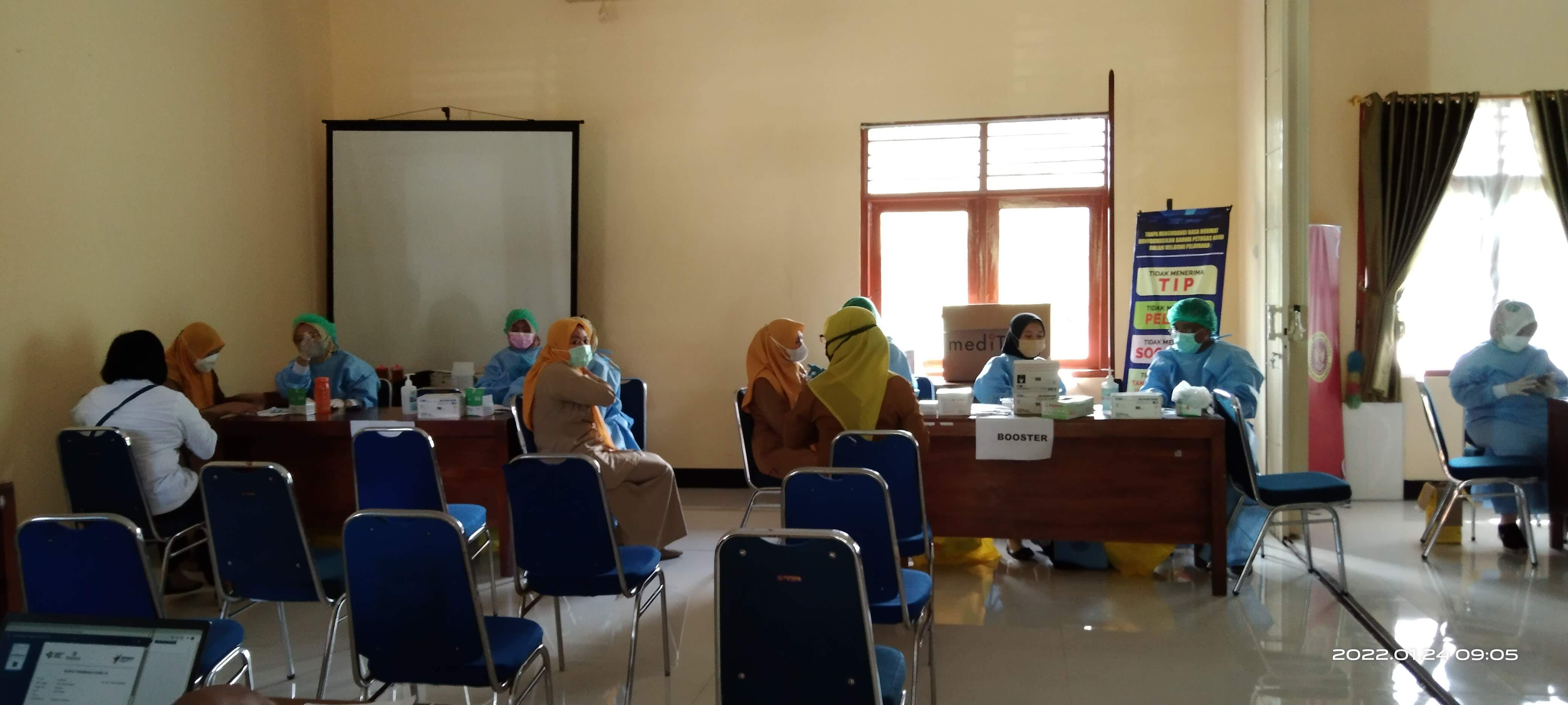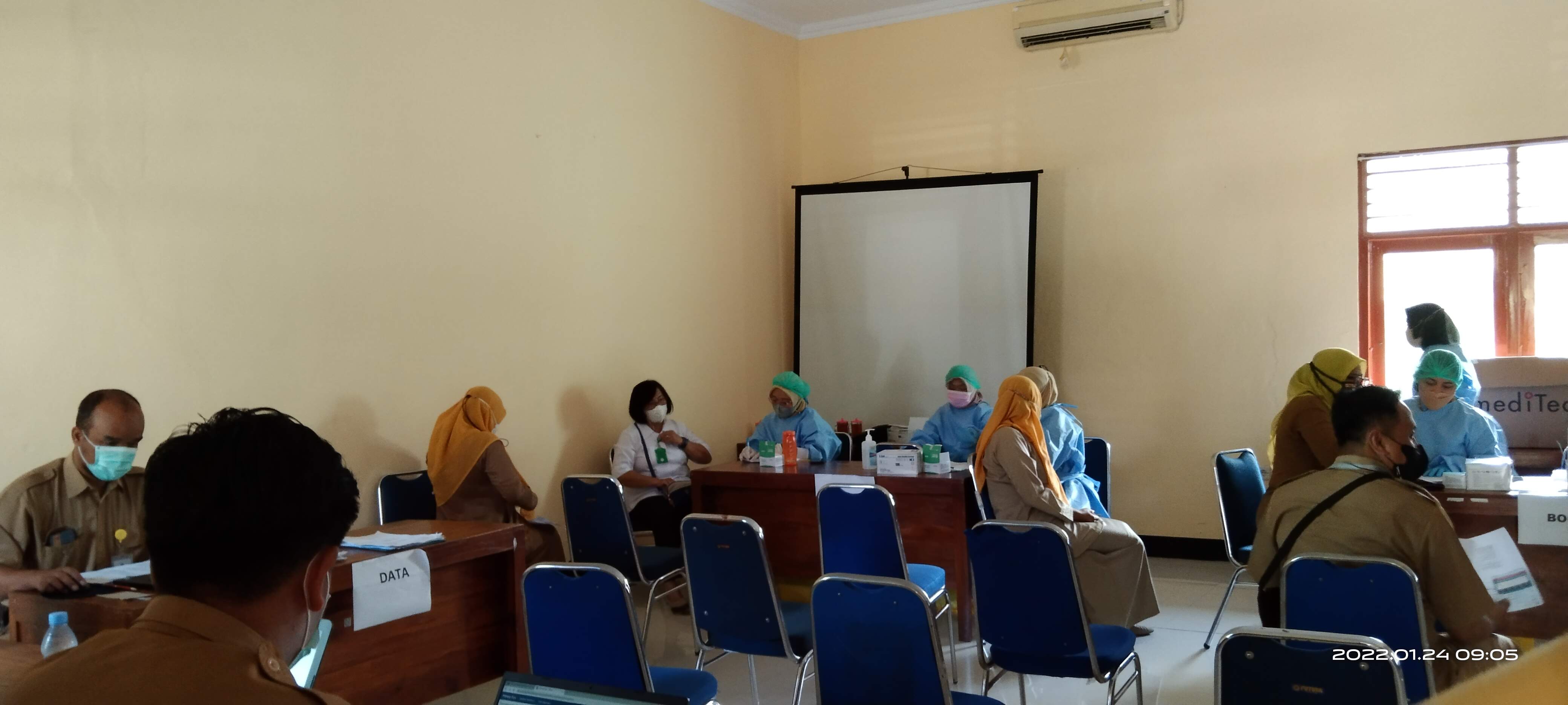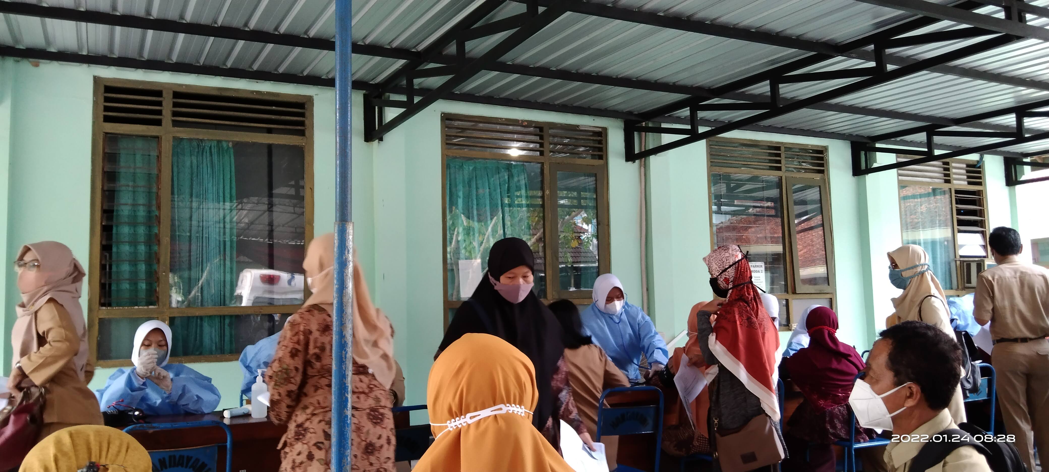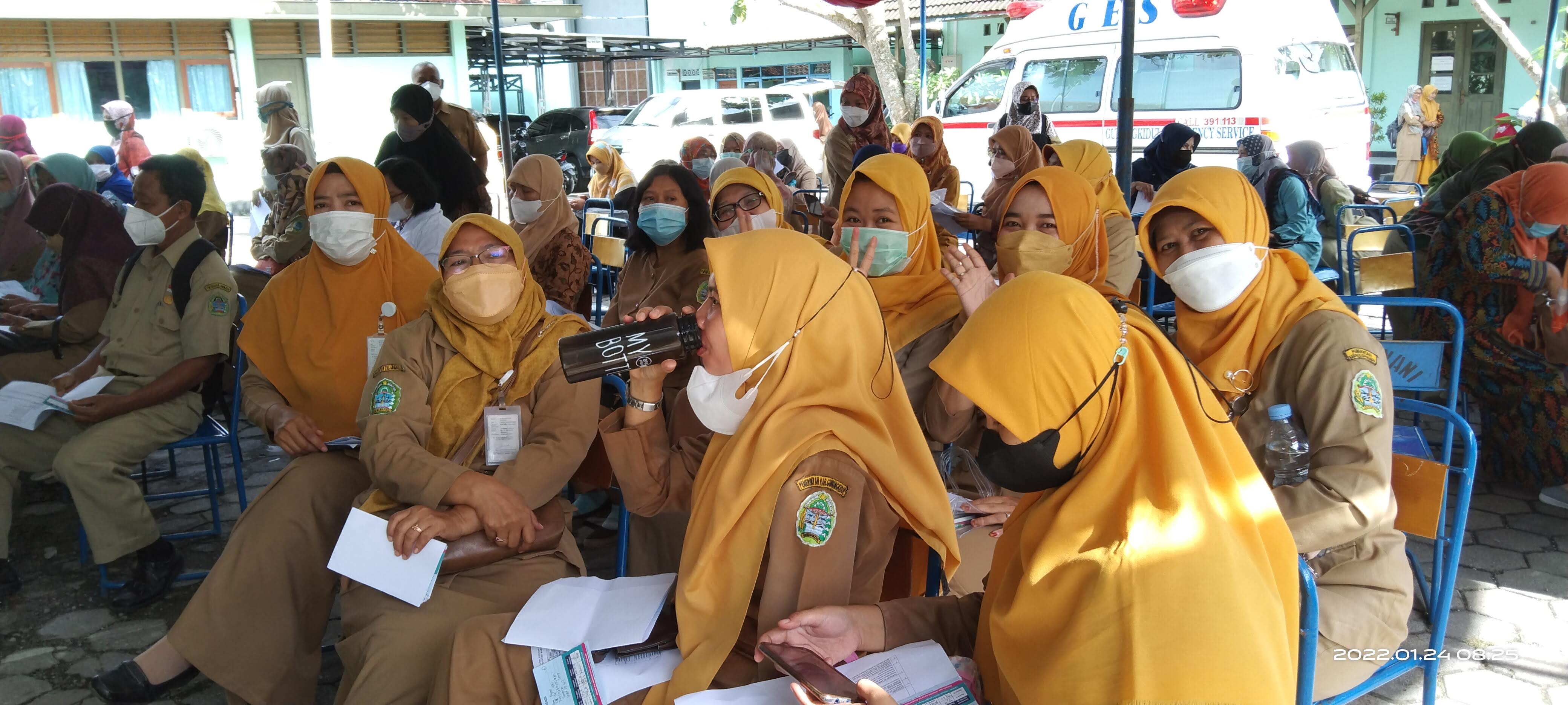 Deskripsi : Guru dan karyawan SD N Wonosari I menerima vaksin Covid-19 dosis ketiga di Dinas Kesehatan Kabupaten Gunungkidul pad atanggal 24 Januari 2022